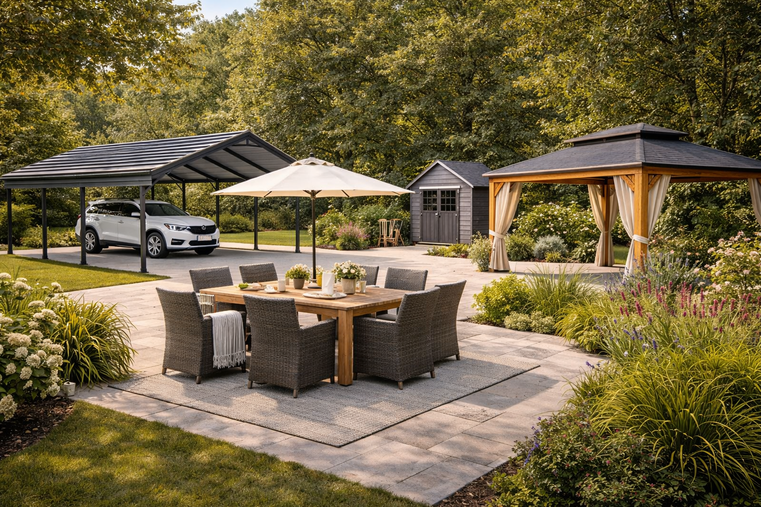 Nest Detail propose une sélection de tables, tonnelles de jardin, abris de jardin et abris de voiture, conçus pour organiser et structurer les espaces extérieurs.
